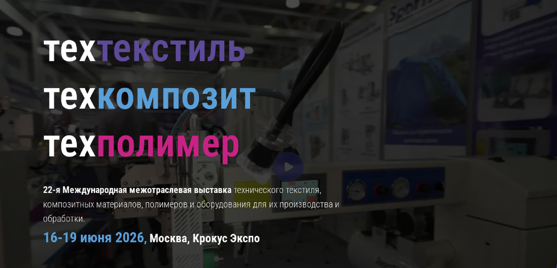 Техтекстиль/Техкомпозит/Техполимер —динамично развивающаяся выставка индустрии технического текстиля, композитных материалов, полимеров, демонстрирует современное оборудование, различные материалы и технологии для переработки и производства изделий. Постоянно растущая экспозиция и уникальная целевая аудитория создают благоприятные условия для взаимодействия деловых партнеров, развития бизнеса и роста полимерной отрасли в России.