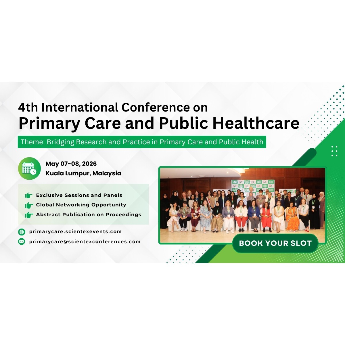 The exhibition, held alongside the conference from May 07–08, 2026, in Kuala Lumpur and virtually on May 21–22, 2026, will feature healthcare organizations, academic institutions, and industry leaders showcasing innovations, services, and technologies in primary care and public health. It offers a valuable platform for networking, collaboration, and visibility among professionals a